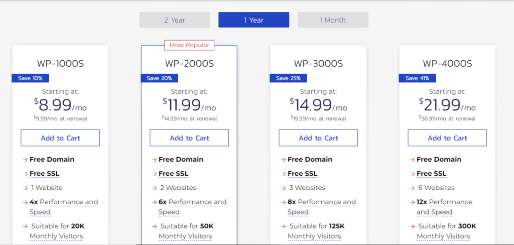 The WordPress hosting plan starts from $8.99/month for the 1-year plan, and $6.99/month for the 2-year plan.