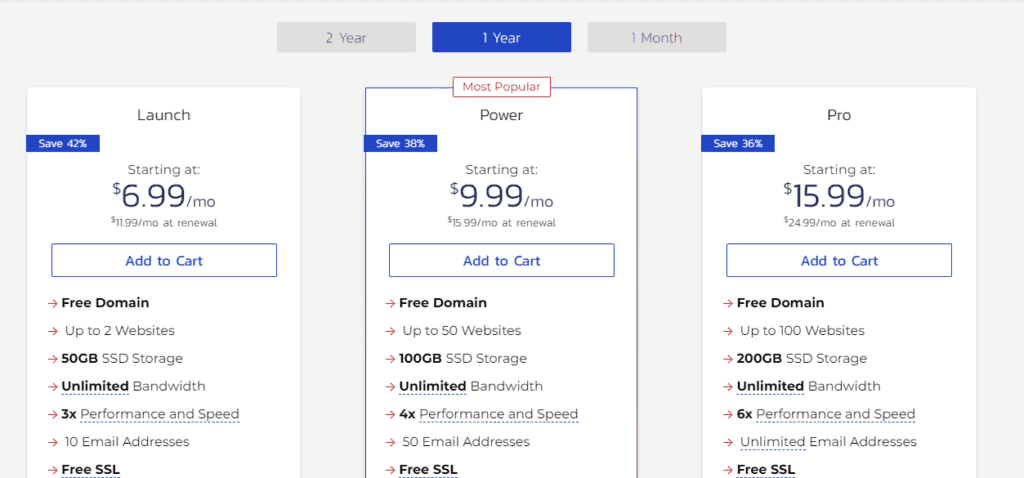 When evaluating your options, look for hosting providers offering tiered plans. A tiered plan system will make it easy for you to choose a plan that best fits your current storage & feature needs. You can scale to a more advanced plan as your website grows.
